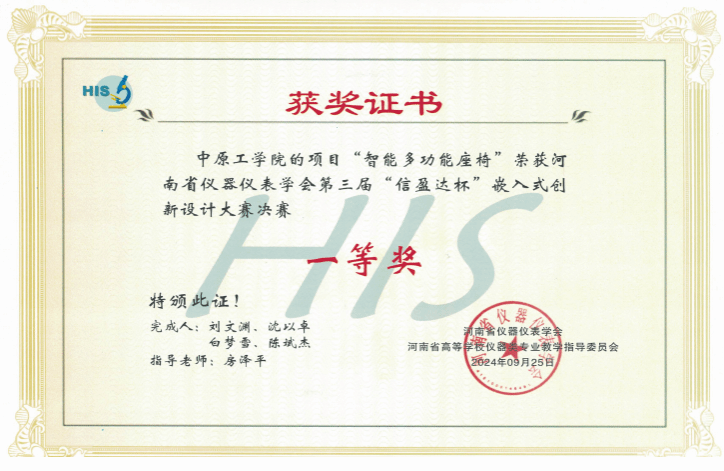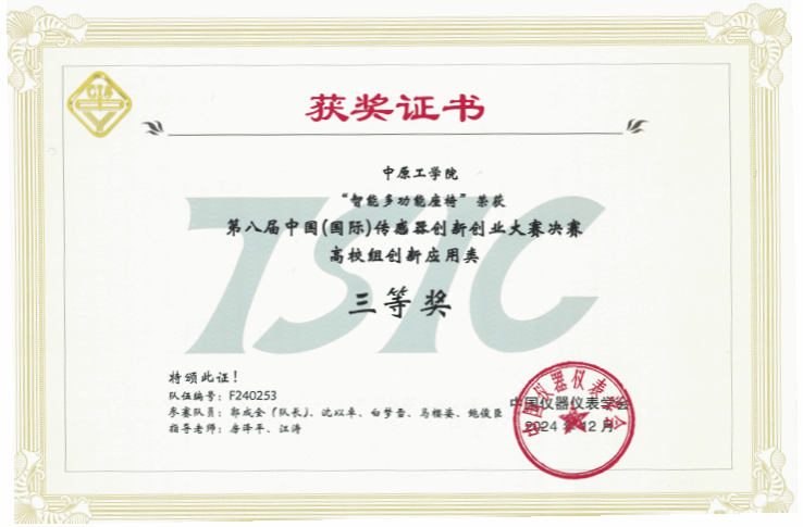 11月30日-12月1日,第八届中国(国际)传感器创新创业大赛获全国总决赛在郑州国际会展中心举行。在我院房泽平和江涛老师指导下,学生团队郭成全、沈以卓、白梦雪、马樱姿、鲍俊臣完成的作品《智能多功能座椅》进入全国总决赛,并最终荣获“高校组创新应用类”三等奖。此前,该作品获得第八届中国(国际)传感器创新创业大赛河南赛区选拔赛一等奖、第三届“信盈达杯“嵌入式创新设计大赛一等奖。